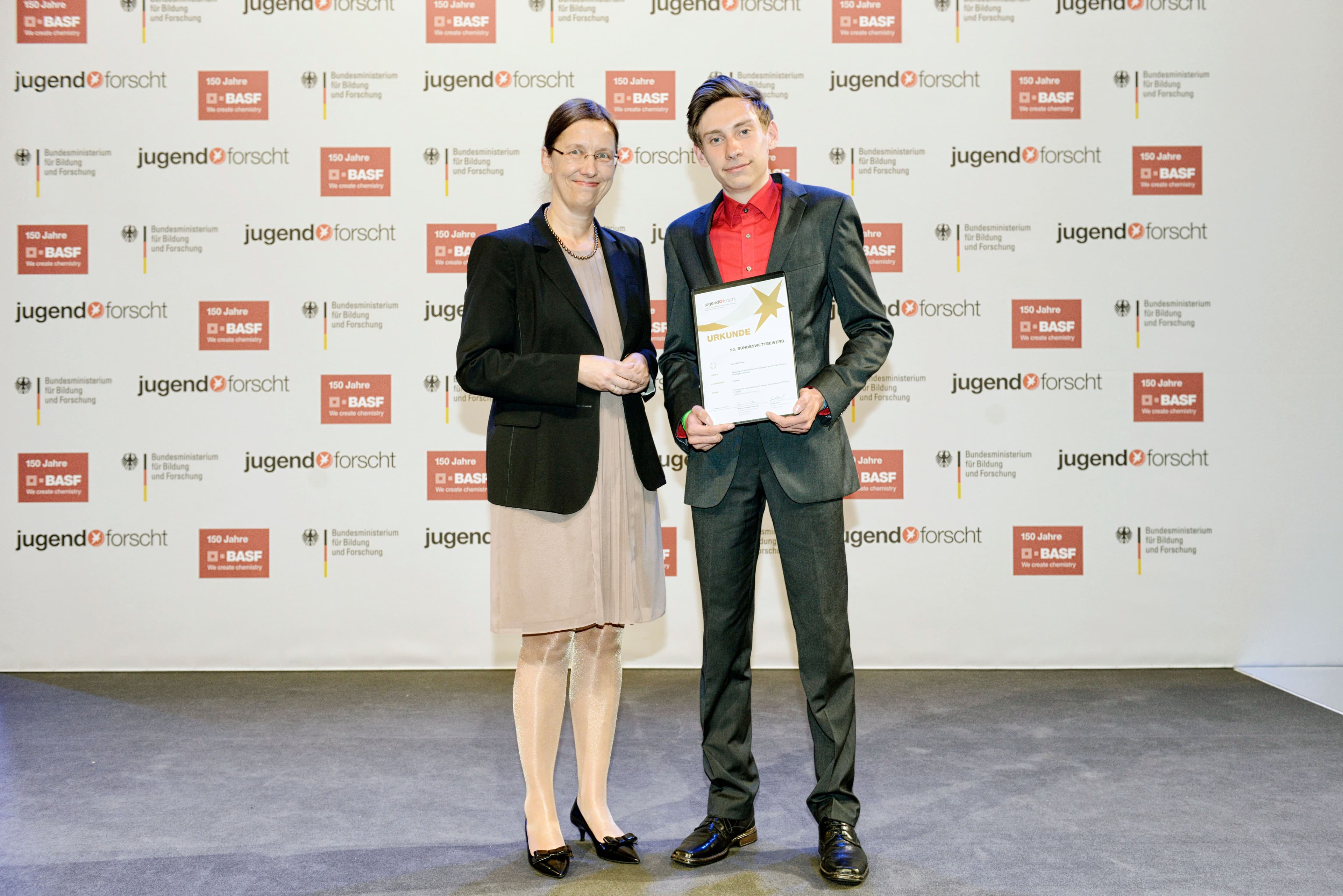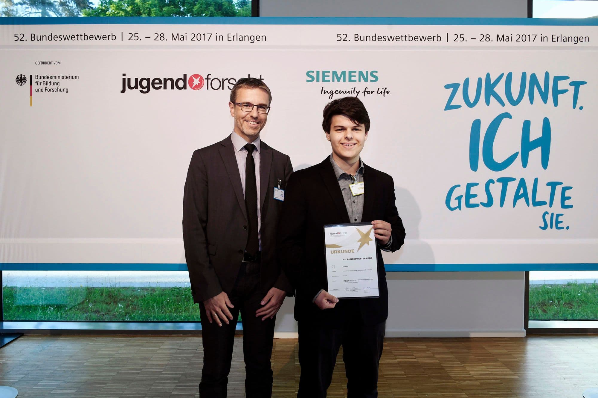Die Jury überzeugte der Jungforscher mit seiner Kreativität und seinem fundierten Fachwissen. Mit seinem Projekt bewies er ein großes Maß der Eigenständigkeit und Zielstrebigkeit. Seine schriftliche Arbeit und auch seine Präsentation zeigten ein hohes wissenschaftliches Niveau.