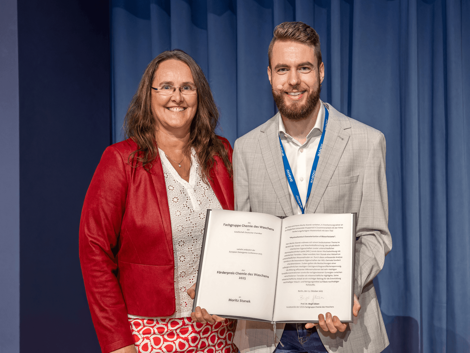 Anlässlich der European Detergents Conference am 15. Oktober 2025 in Berlin verlieh die Fachgruppe Chemie des Waschens die 2025er Förderpreise an Lena Nielinger (TU Dortmund) und Moritz Stanek (Henkel / Universität Wuppertal).