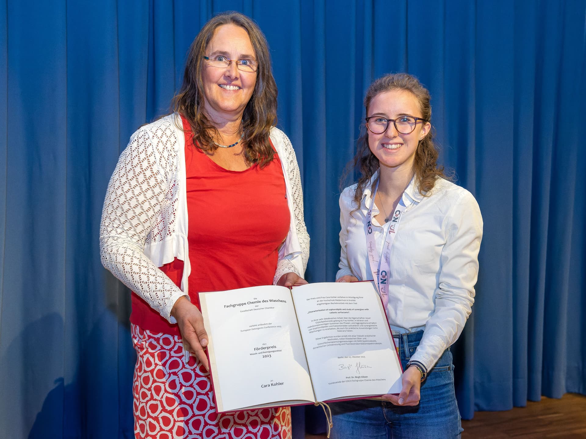 Carla Kohler erhielt den Förderpreis für ihre herausragende Bachelorarbeit mit dem Titel: „Characterization of sophorolipids and study of synergism with cationic surfactants“. "In ihrer sehr detailreichen Arbeit über die Eigenschaften neuer Glykolipidtenside gelang es Frau Kohler, in binären und mehrkomponentigen Systemen das Phasen- und Aggregationsverhalten von Sophorolipiden und Kationtensiden aufzuklären und synergistische Mischungen zu erarbeiten, die auch für praktische Anwendungen hohe Relevanz haben. Diese Ergebnisse wurden erzielt mit einer Vielzahl analytischer Methoden, neben klassischen Ober- und Grenzflächenspannungsmessungen mit NMR-Spektroskopie, dynamischer Lichtstreuung und Fluoreszenzkorrelationsspektroskopie."
