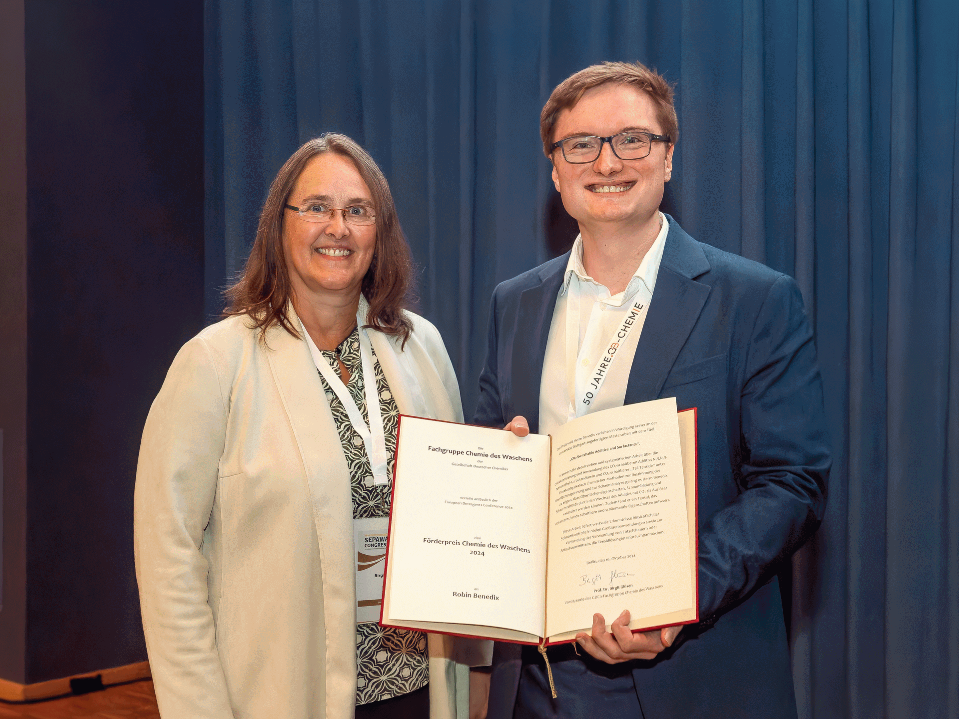 Die Fachgruppe Chemie des Waschens der Gesellschaft Deutscher Chemiker (GDCh) verleiht – preiswürdige Vorschläge vorausgesetzt – jährlich je einen Förderpreis für eine herausragende Bachelorarbeit, eine Master-/Zulassungsarbeit und eine Dissertation mit besonderer Relevanz für die Entwicklung von Wasch- und Reinigungsmitteln. Die Preise sind mit jeweils 1000 Euro, 2000 Euro bzw. 3000 Euro dotiert und werden im Rahmen der Fachgruppentagung European Detergents Conference verliehen, die jedes Jahr im Oktober unter dem Dach des SEPAWA CONGRESS in Berlin stattfindet.