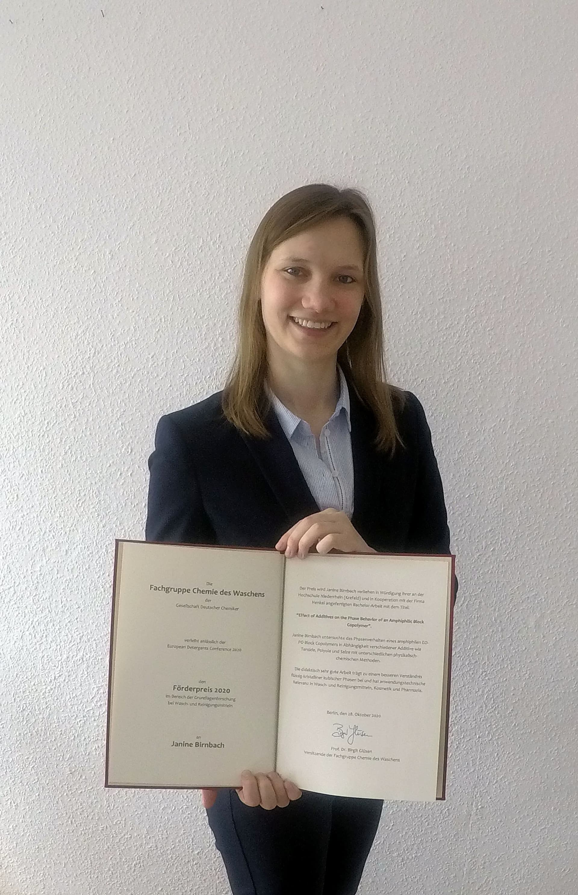 Lena Nielinger erhielt den Förderpreis für ihre herausragende Bachelorarbeit mit dem Titel Investigating the Aggregation Properties of Ionic/Non-Ionic Hybrid Detergents: "Frau Lena Nielinger gelang es erstmalig, die Mizellbildungskonzentration von ionisch/nicht-ionischen Hybridseifen mit dynamischer Lichtstreuung zu bestimmen. Nachdem Frau Nielinger bestätigten konnte, dass lediglich die konzentrationsabhängige Analyse von Diffusionskoeffizienten eine reproduzierbare Bestimmung von Mizellbildungskonzentrationen ermöglicht, konnte sie darauf aufbauend die Eigenschaften der Mizellen von ionisch/nicht-ionischen Hybridseifen untersuchen. Ihre Ergebnisse zeigten, dass Mizellen von ionisch/nicht-ionischen Hybridseifen ähnlich gut hydrophobe Farb- und Wirkstoffe in Wasser lösen können wie herkömmliche ionische Seifen. Frau Nielingers Ergebnisse offenbarten vielversprechende Ansatzpunkte für die Entwicklung von Seifen, die vielseitig einsetzbar sind und gleichzeitig eine außergewöhnliche Kompatibilität gegenüber Zellmaterial aufweisen."
