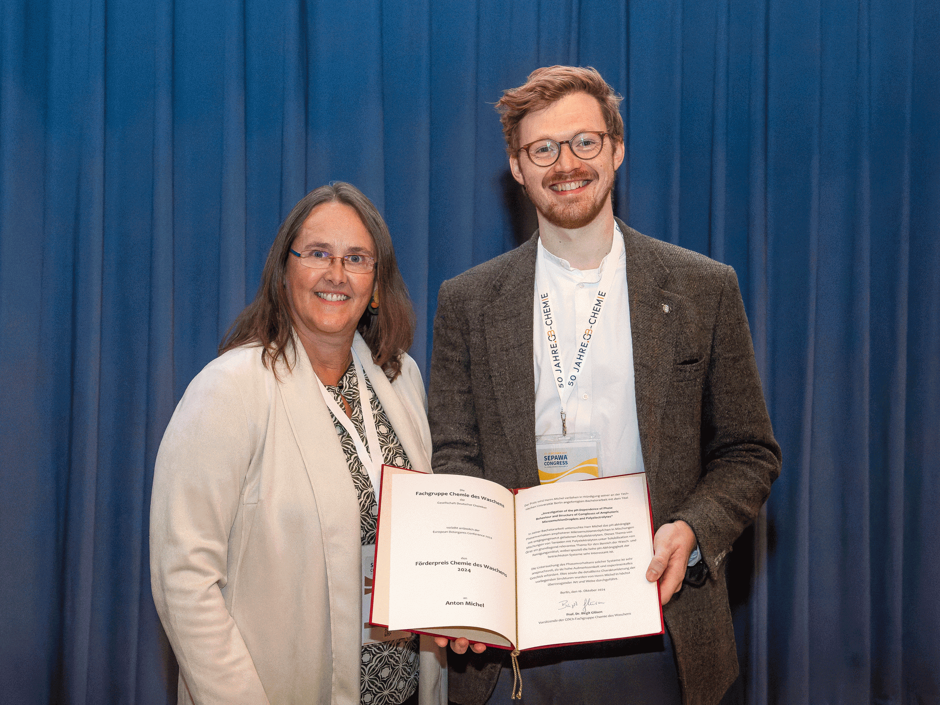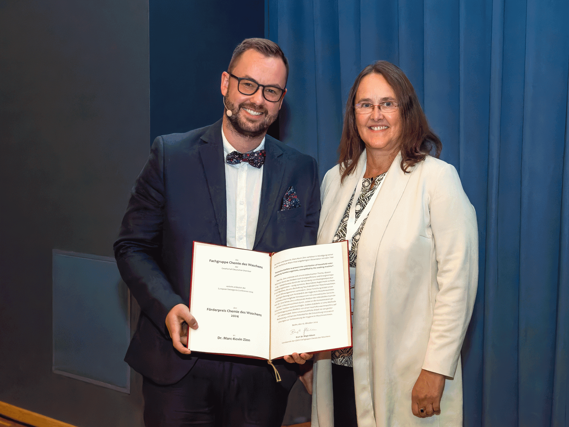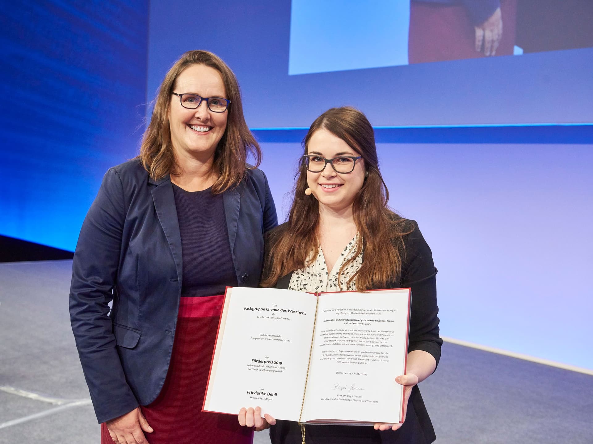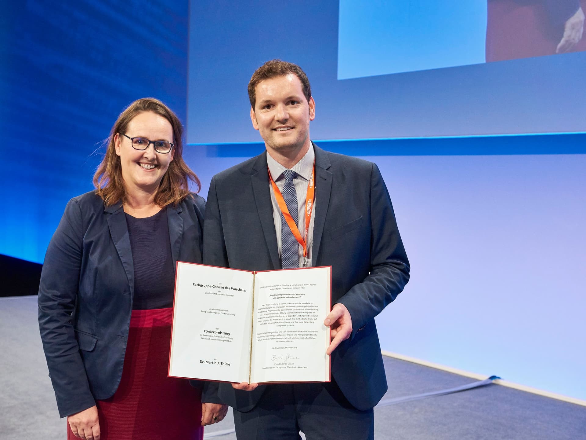 Anlässlich der European Detergents Conference am 23.10.2019 in Berlin verlieh die Fachgruppe Chemie des Waschens Förderpreise im Bereich der Grundlagenforschung bei Wasch- und Reinigungsmitteln an Dr. Martin J. Thiele (RWTH Aachen) und Friederike Dehli (Universität Stuttgart).