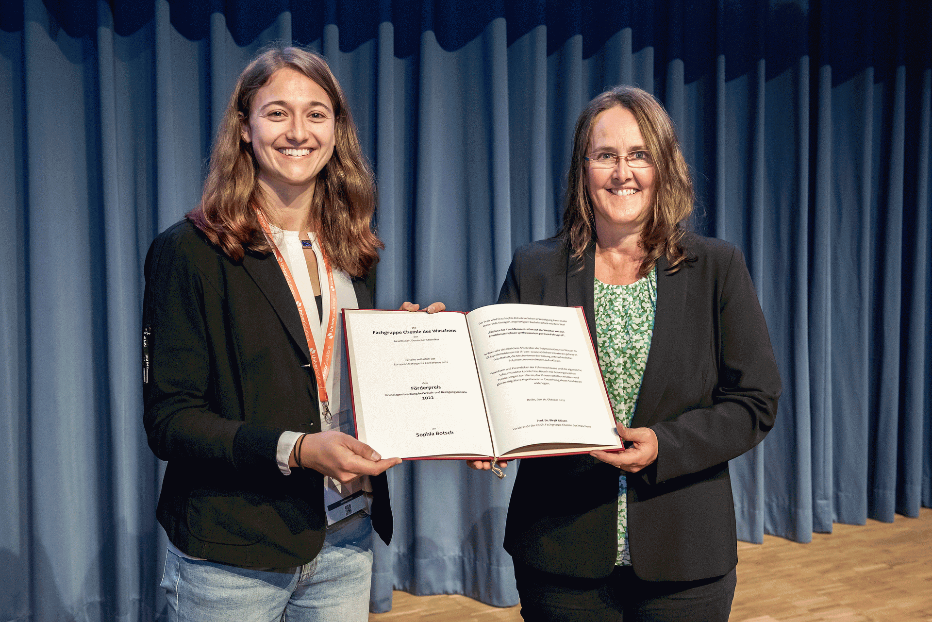Anlässlich der European Detergents Conference am 26. Oktober 2022 in Berlin verlieh die Fachgruppe Chemie des Waschens Förderpreise im Bereich der Grundlagenforschung bei Wasch- und Reinigungsmitteln an Dr. Christoph Brudl (Technische Universität Graz), Hailey Poole (Universität Stuttgart) und Sophia Botsch (Universität Stuttgart).