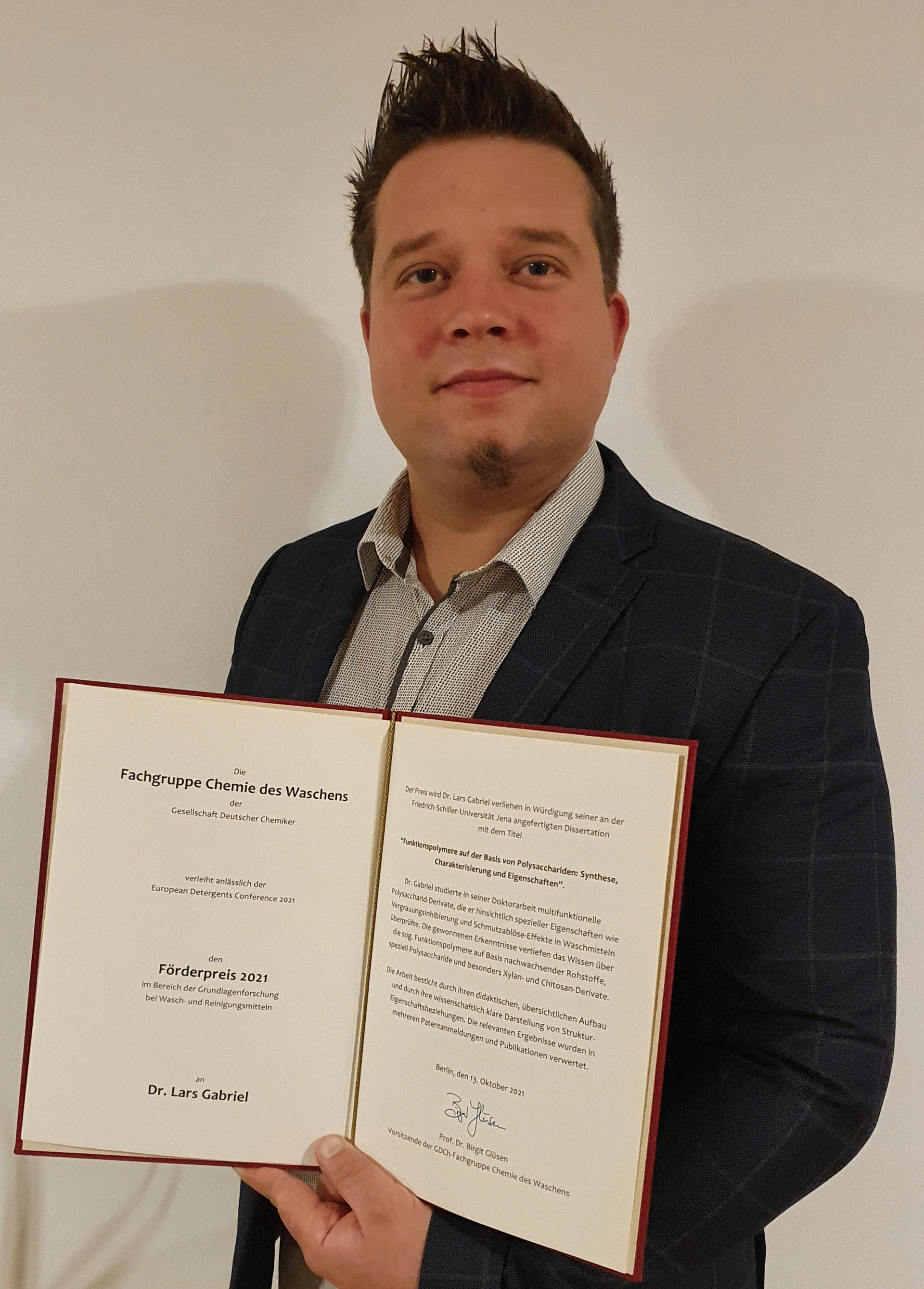 Anlässlich der European Detergents Conference am 13.10.2021 in Berlin verlieh die Fachgruppe Chemie des Waschens Förderpreise im Bereich der Grundlagenforschung bei Wasch- und Reinigungsmitteln an Dr. Lars Gabriel (Friedrich-Schiller-Universität Jena) und Jan Nilles (Kao Chemicals GmbH, Emmerich, und Hochschule Niederrhein, Krefeld).
