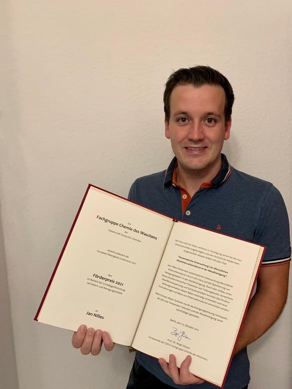 Jan Nilles erhielt den Förderpreis für seine herausragende Masterarbeit mit dem Titel: "Systematische Untersuchung von alkoxylierten Alkylethercarbonsäuren in der Metallreinigung". Herr Nilles hat eine systematische Untersuchung alkoxylierter Ethercarbonsäuren durchgeführt mit dem Fokus auf der Optimierung von Reinigungsbädern in der Metallreinigung. Durch den Aufbau eines Satzes von physikochemischen Parametern wie Trübungspunkt, dynamische Oberflächenspannung und Schaumverhalten konnte das Struktur-Wirkungsverhalten dieser Bäder erstmalig verstanden werden und neue Formulierungen auf Basis von Ethercarbonsäuren entwickelt werden. Beim Einsatz dieser Systeme konnte die Reinigungsleistung verdoppelt werden, die Zeit und Temperatur reduziert und die Metallreinigung somit nachhaltiger gestaltet werden.