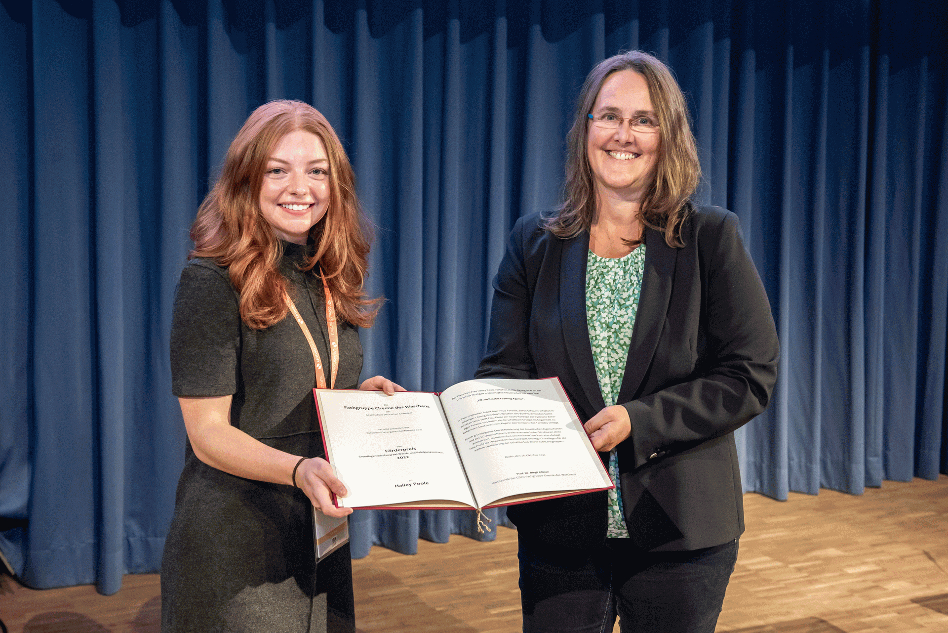 Hailey Poole erhielt den Förderpreis für ihre herausragende Masterarbeit mit dem Titel: „CO2-Switchable Foaming Agents“. "In ihrer originellen Arbeit über neue Tenside, deren Schaumverhalten in wässriger Lösung sich durch Variation des durchströmenden Gases schalten lässt, stellt Frau Poole ein neues Konzept zur Synthese derartiger Tenside vor, indem sie die schaltbare Gruppe im Gegensatz zu bekannten Strukturen vom Kopf in den Schwanz des Tensides verlegt. Durch grundlegende Charakterisierung der tensidischen Eigenschaften und des Schaumverhaltens dreier exemplarischer Strukturen eines anionischen, nichtionischen und kationischen Vertreters belegt Frau Poole die Wirksamkeit des Konzepts und legt Grundlagen für die weitere Optimierung der Schaltbarkeit dieser Substanzgruppen."
