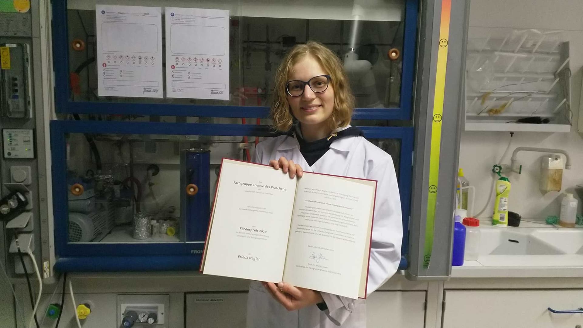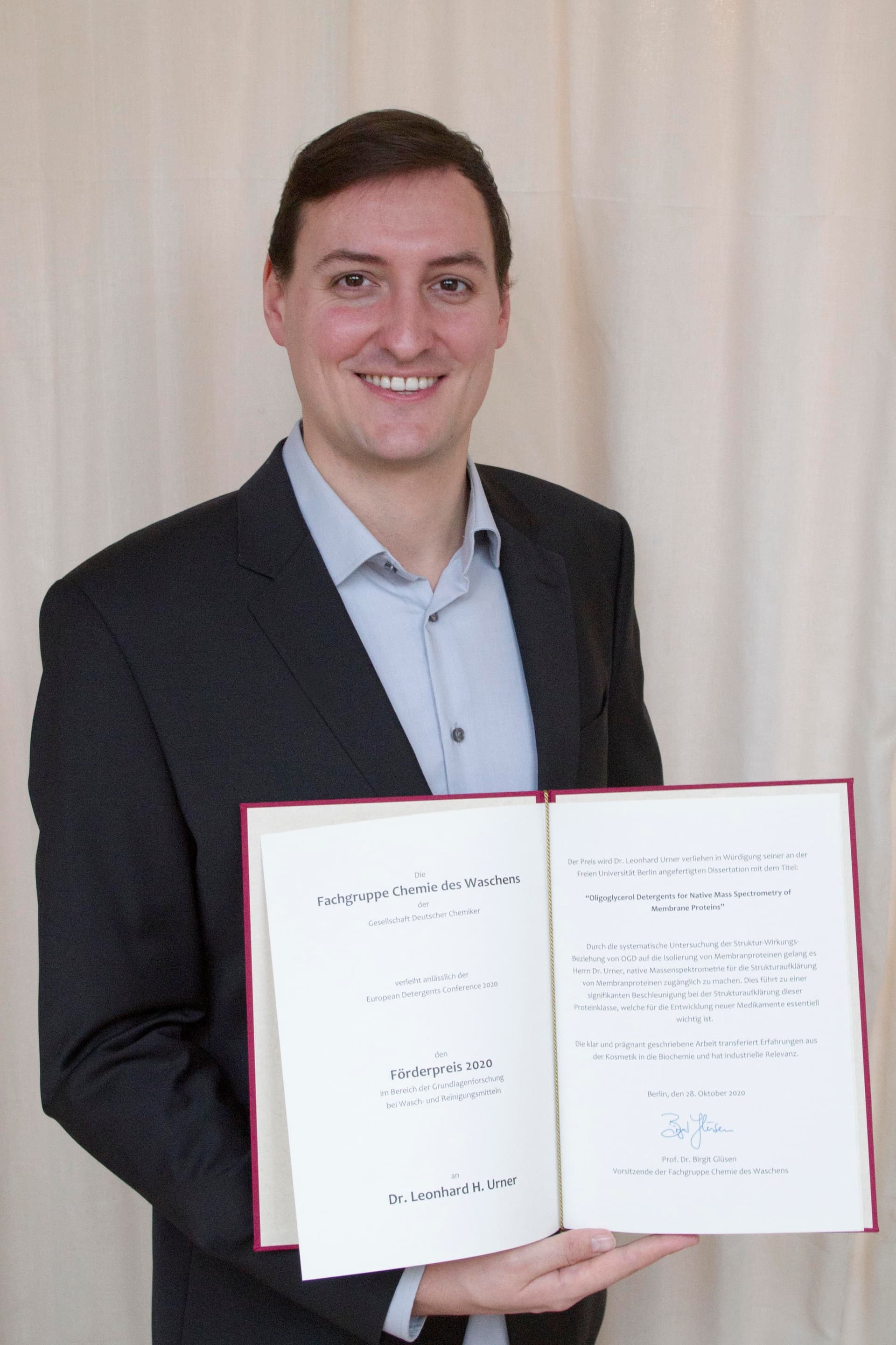 Anlässlich der European Detergents Conference am 28.10.2020 in Berlin verlieh die Fachgruppe Chemie des Waschens Förderpreise im Bereich der Grundlagenforschung bei Wasch- und Reinigungsmitteln an Janine Birnbach (Hochschule Niederrhein, Krefeld, in Kooperation mit der Firma Henkel), Frieda Nagler (Friedrich-Schiller-Universität Jena) und Dr. Leonhard H. Urner (Freie Universität Berlin).