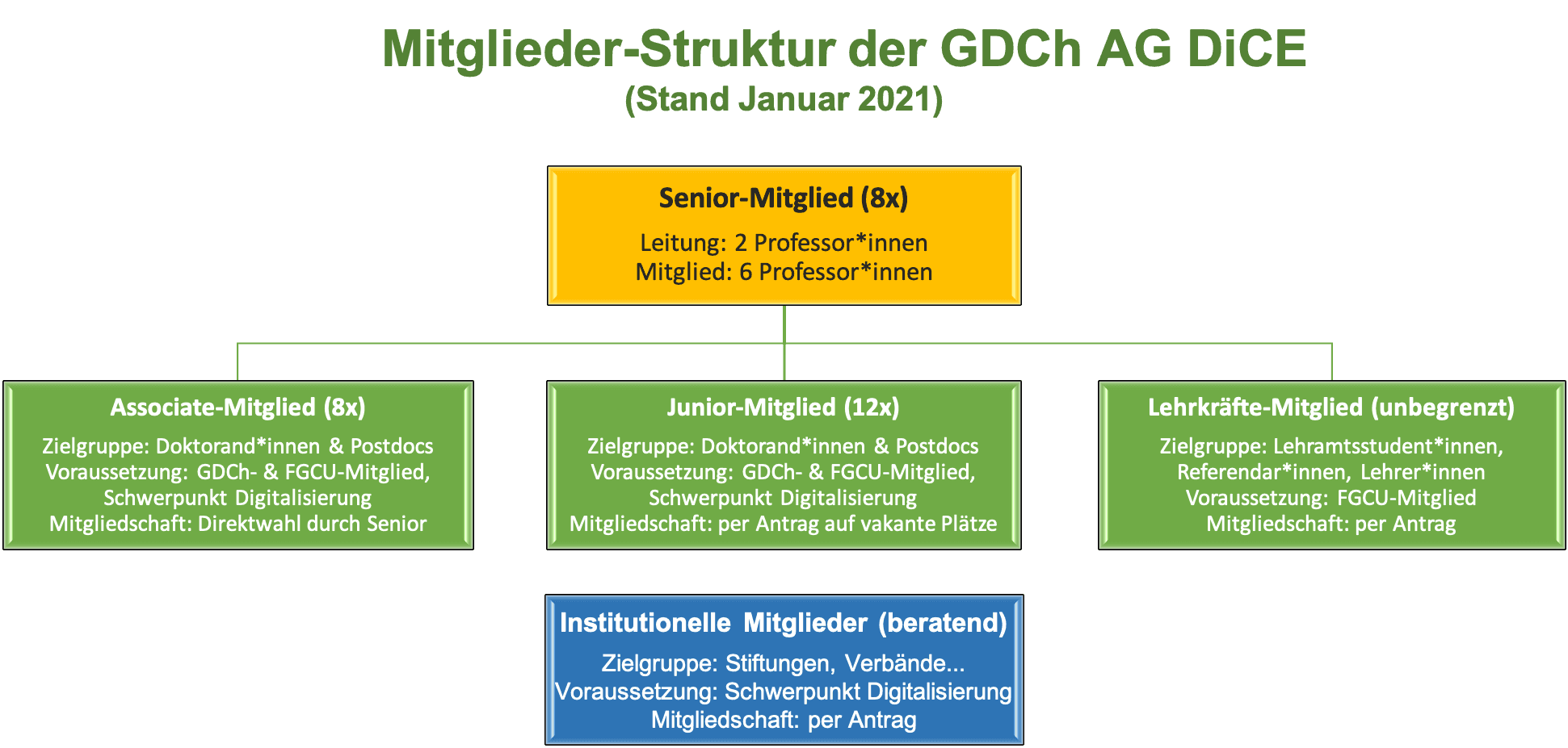 Die AG DiCE wurde am 17.09.2019 auf der 36. Jahrestagung der Fachgruppe Chemieunterricht in Aachen gegründet. Die Mitglieder der AG DiCE gehören verschiedenen Berufsgruppen an, darunter Lehrer*innen, Wissenschaftler*innen und Vertreter*innen aus Industrieverbänden und Stiftungen. Mit Stand Januar 2021 zählen wir 31 Mitglieder. Das Bild unten gibt eine Übersicht zu unserer Mitgliederstruktur.