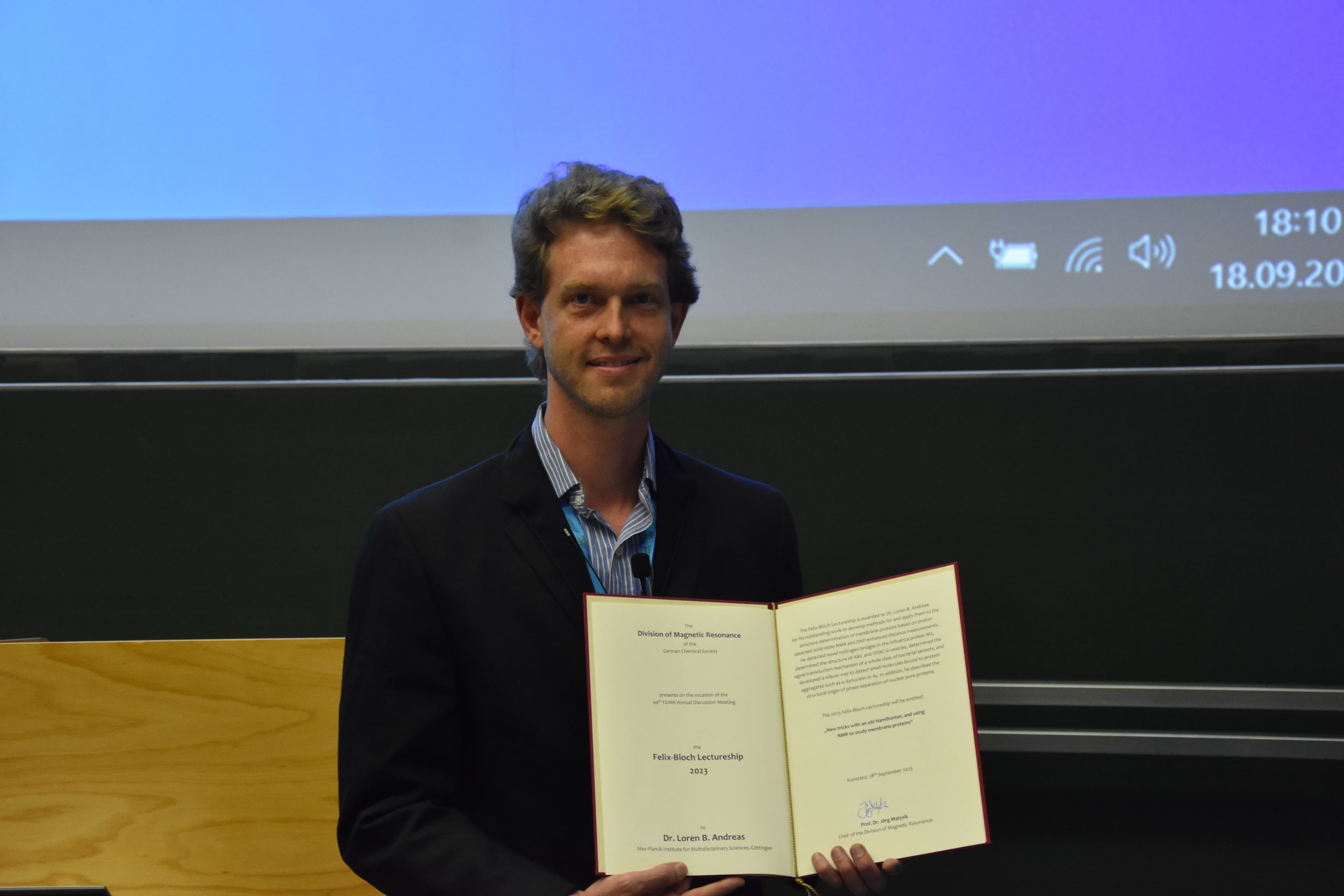 Dr. Loren B. Andreas (Max-Planck Institute for Multidisciplinary Science in Göttingen) wurde am 18. September 2023 im Rahmen des 44. FGMR Annual Discussion Meetings in Konstanz mit der Felix-Bloch-Vorlesung 2023 ausgezeichnet.