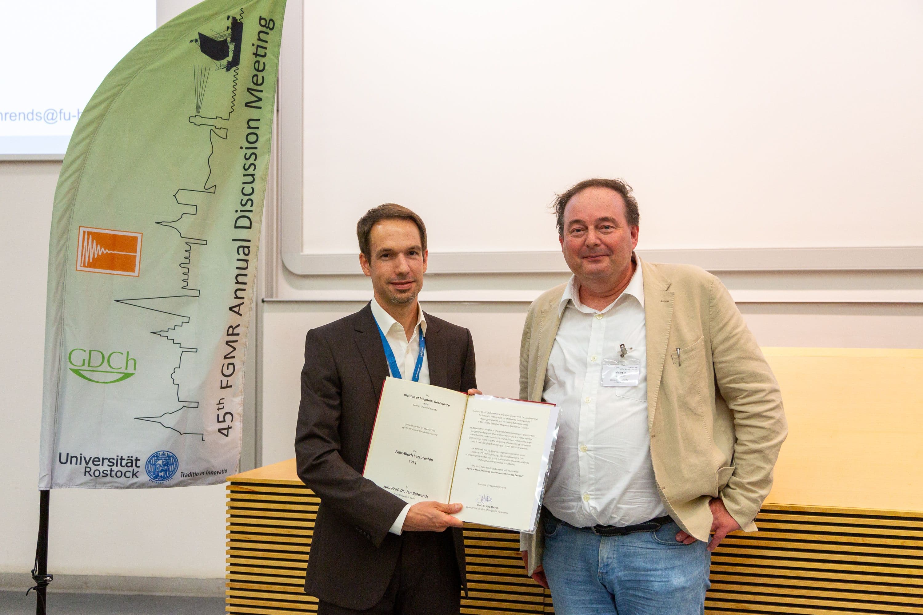Jun.-Prof. Dr. Jan Behrends (Freie Universität Berlin) wurde am 9. September 2024 im Rahmen des 45. FGMR Annual Discussion Meetings in Rostock mit der Felix-Bloch-Vorlesung 2024 ausgezeichnet.