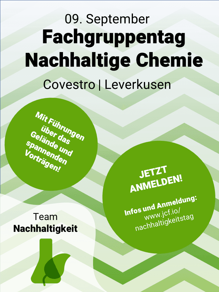 Deine Forschung in Promotion, Bachelor- oder Masterarbeit richtet sich an nachhaltige Themen oder grüne Aspekte der Chemie und Du möchtest diese gerne vorstellen? Dann gibt es die Option, den Fachgruppentag mit einem Vortrag (à 15 min + 5 min Diskussionsrunde, Vortragssprache: Deutsch / optional englisch) zu bereichern. Es stehen drei Vortrags-Slots zur Verfügung, die “first come, first serve” vergeben werden.