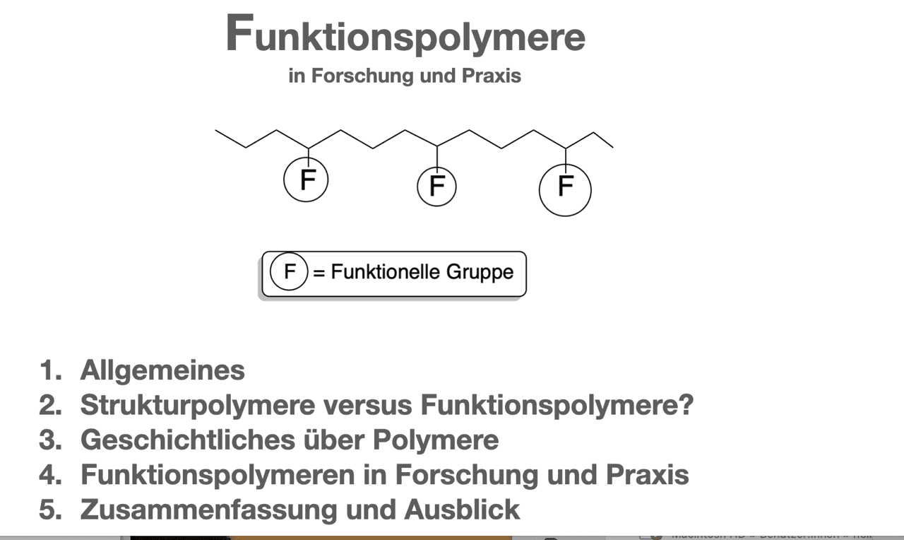 Die Entwicklung und Anwendung einiger Funktionspolymere stehen im Mittelpunkt des Vortrags. Einleitend wird der Begriff im Vergleich zu Struktur-Polymeren kritisch beleuchtet. Ein kurzer Blick auf die geschichtliche Bedeutung der Kunststoffe wird dabei hilfreich sein. Es werden eigene Arbeiten präsentiert, die Anwendungsperspektiven beinhalten. Danach folgen
